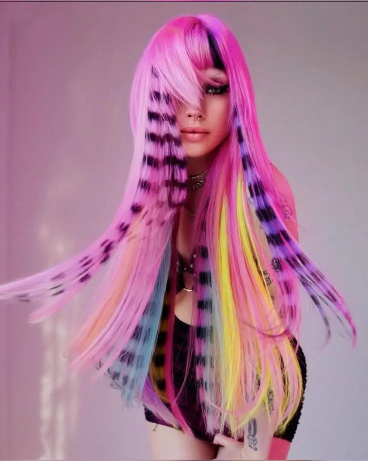 High impact vivid color service designed as wearable hair art. This look features custom shapes, symbols, and multi-tone placement layered intentionally throughout the hair for a bold, Y2K-meets-punk finish. Color placement is fully customized to your lifestyle, haircut, base color, and desired level of contrast, creating movement and visual storytelling from every angle. This is not traditional highlight work it’s expressive, editorial, and unapologetically creative. Because of the complexity and contrast, maintenance level is medium to high depending on shade selection and design.